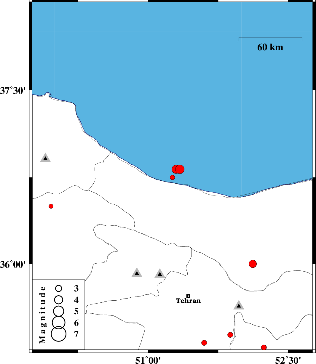 | 2012/08/03 | 03:16:54.4 | 07:46:54.4 | 36.75 | 51.26 | 14 | ML:2.2 | Caspian Sea, 18 km West of Chalus | ||