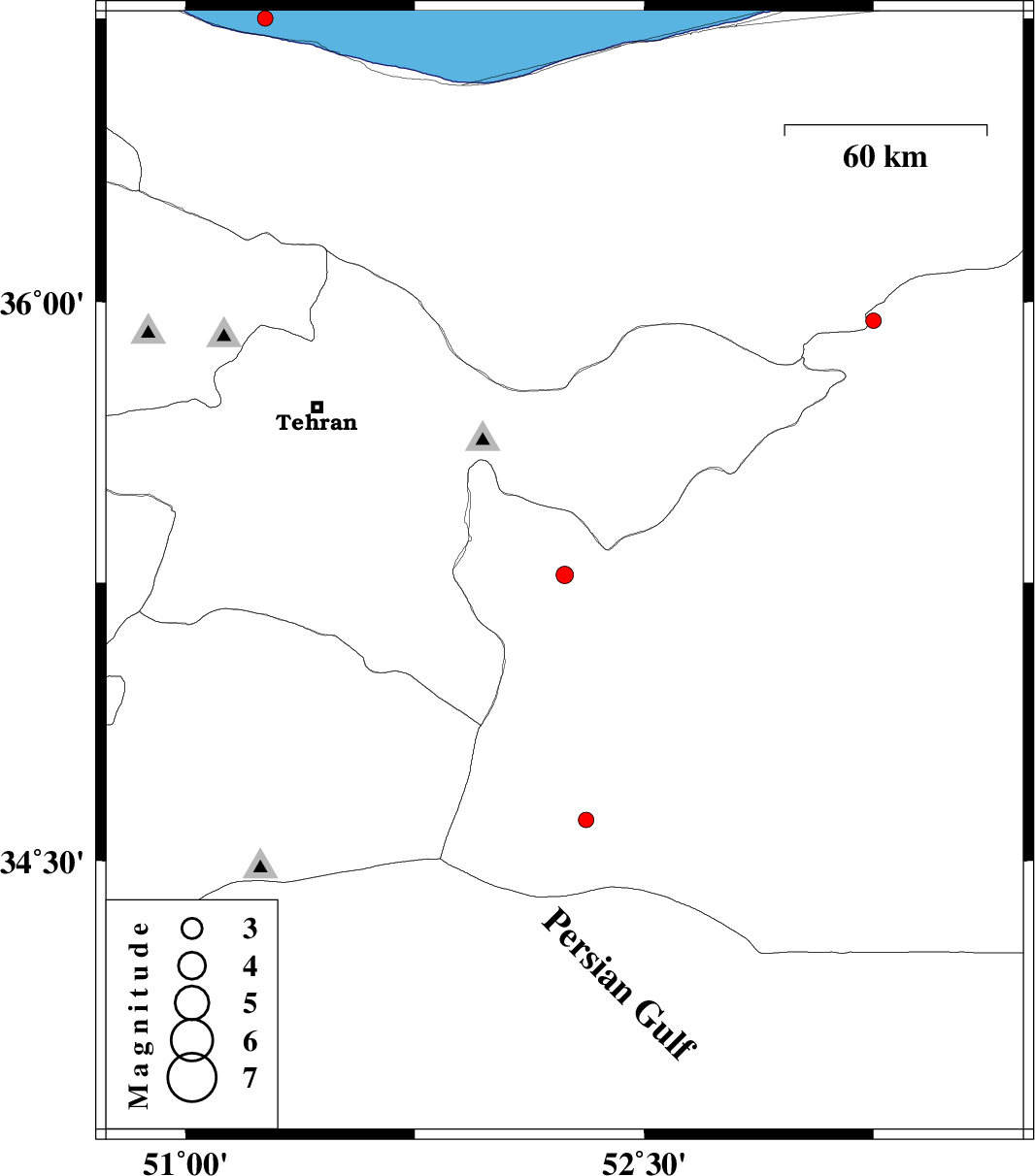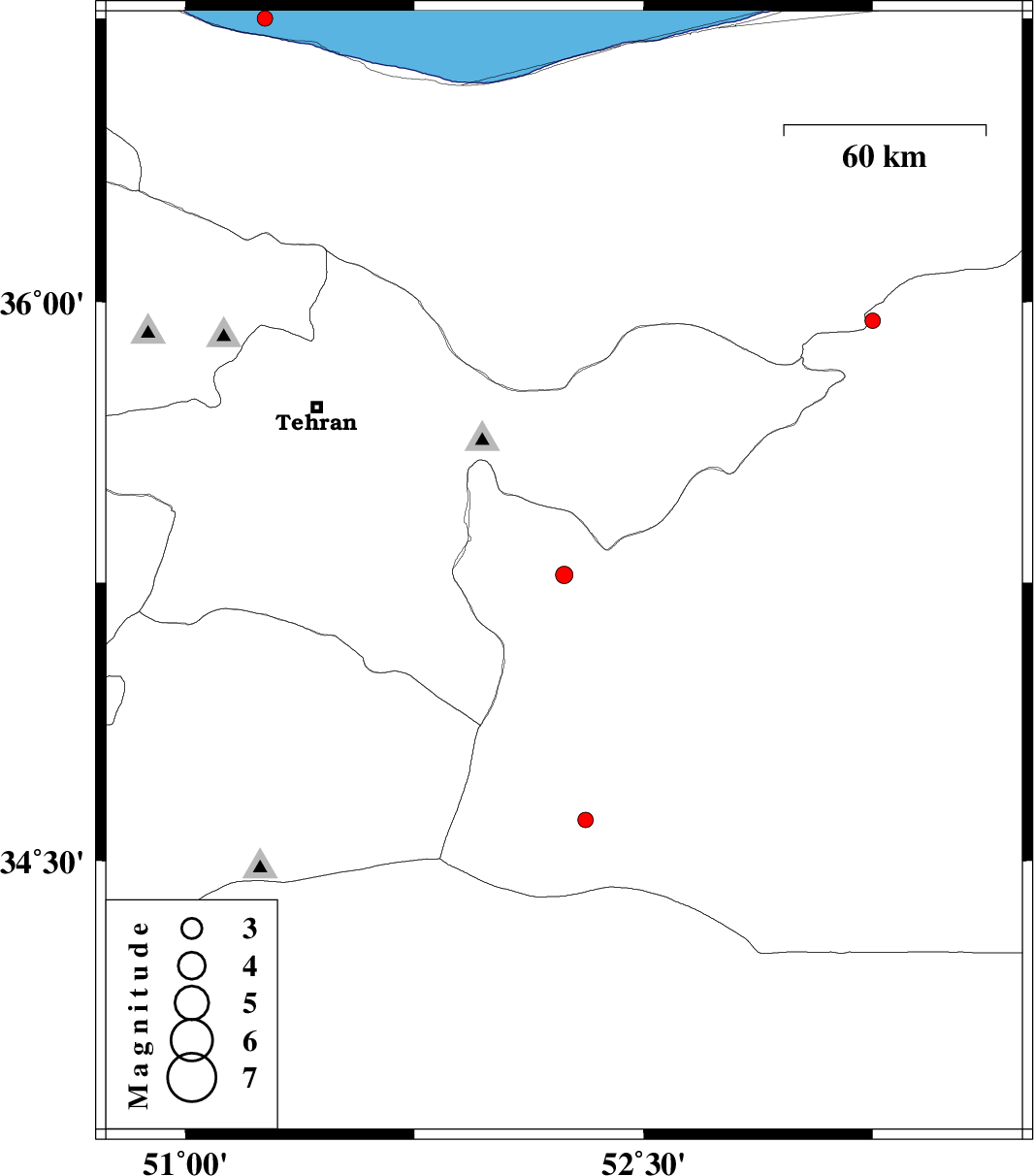 | 2012/08/03 | 03:16:54.4 | 07:46:54.4 | 36.75 | 51.26 | 14 | ML:2.2 | Caspian Sea, 18 km West of Chalus | ||