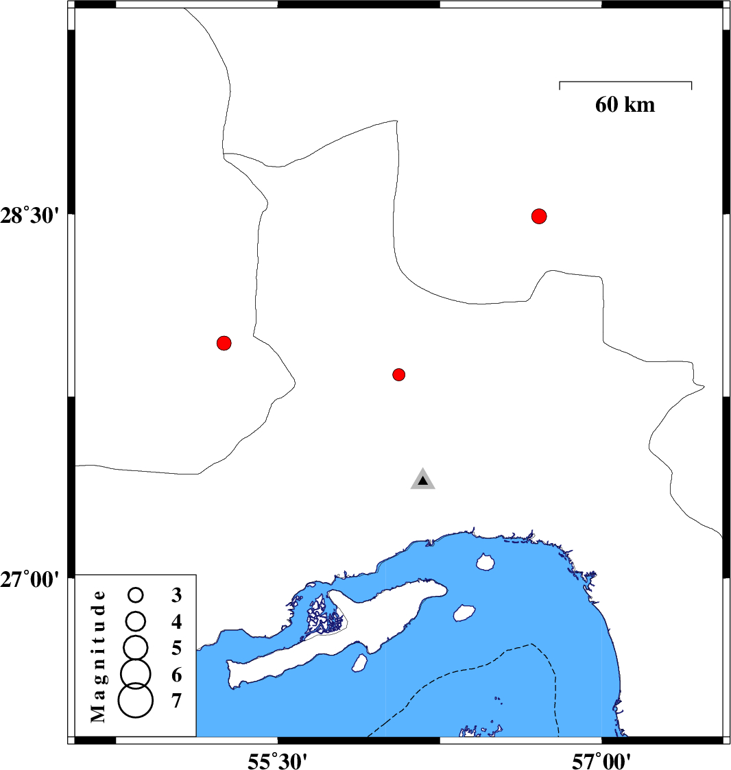 | 2012/07/30 | 17:18:19.8 | 21:48:19.8 | 27.97 | 55.25 | 14 | ML:2.9 | Fars Province, 74 km South-West of Hajiabad |
