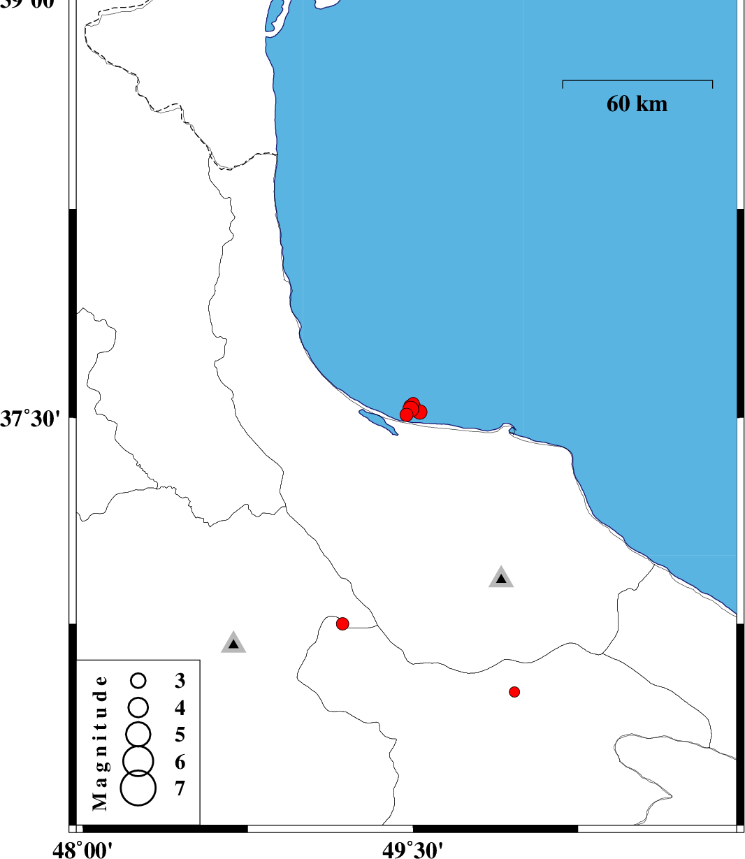 | 2012/08/02 | 11:06:03.5 | 15:36:03.5 | 37.52 | 49.53 | 14 | ML:3 | Caspian Sea, 8 km Bandar-e anzali | ||