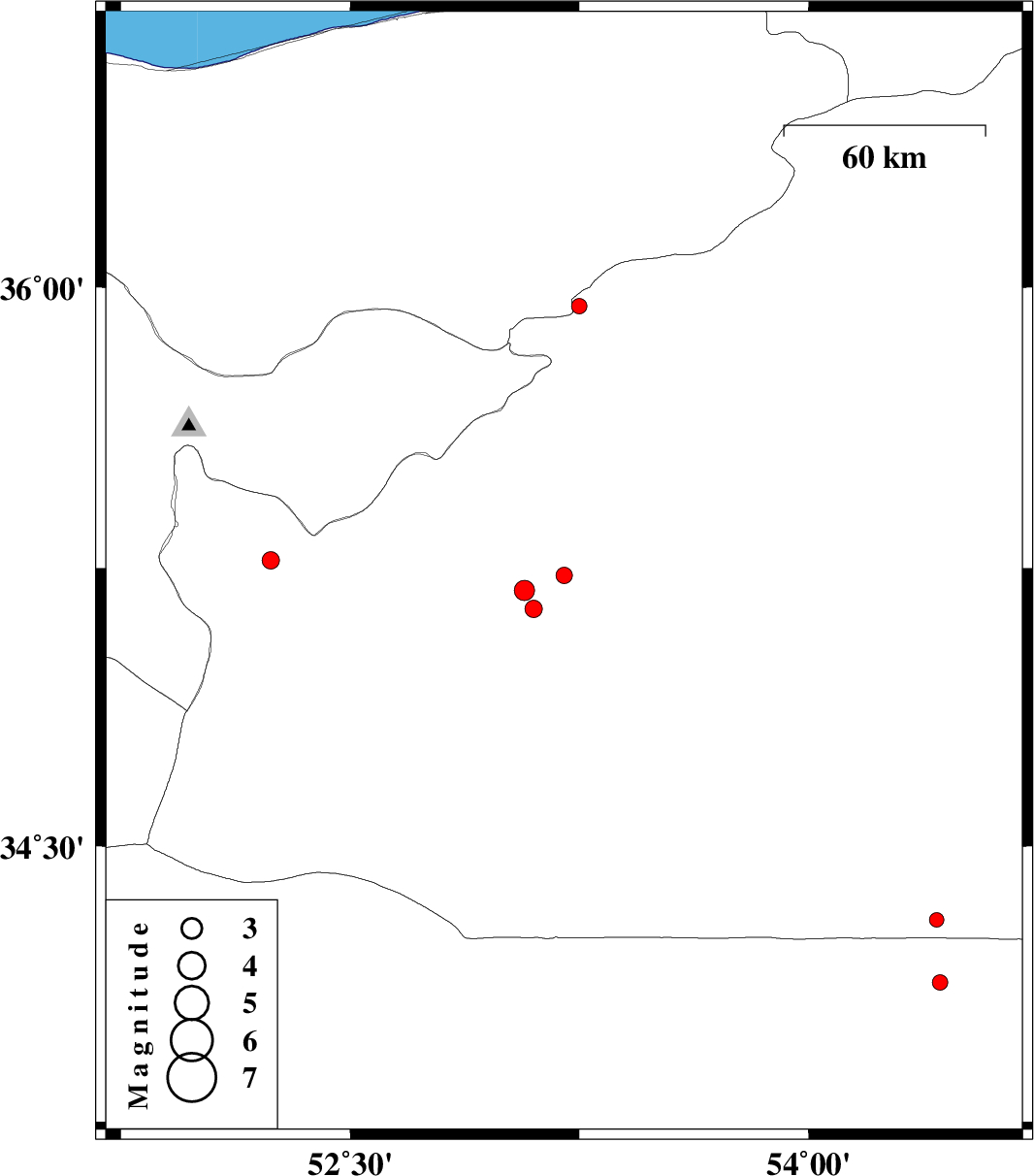 | 2012/07/29 | 21:34:25.7 | 02:04:25.7 | 34.3 | 54.42 | 15 | ML:2.1 | Semnan Province, 208 km South of Damghan |