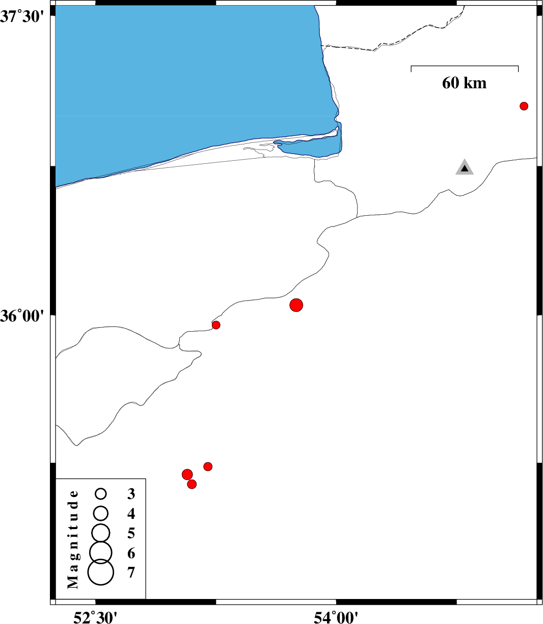 | 2012/08/02 | 20:37:21.4 | 01:07:21.4 | 35.95 | 53.25 | 14 | ML:2.3 | Semnan Province, 26 km South-East of Pol-E-Sefid | ||