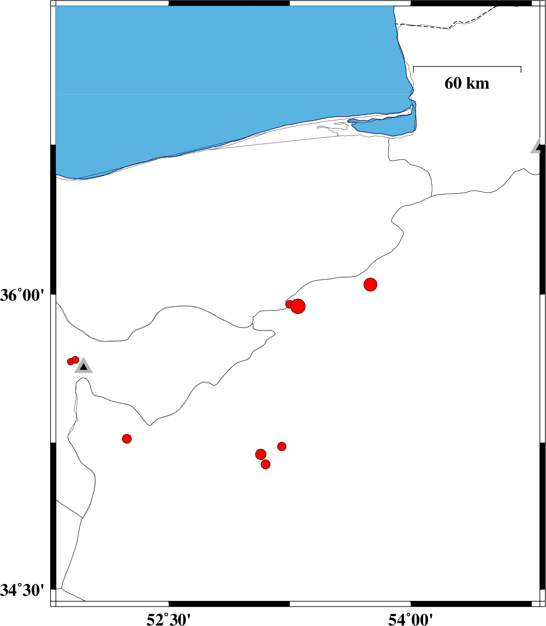 | 2012/08/06 | 07:04:18.3 | 11:34:18.3 | 35.94 | 53.3 | 14 | ML:4.1 | Semnan Province, 29 km South-East of Pol-E-Sefid | ||