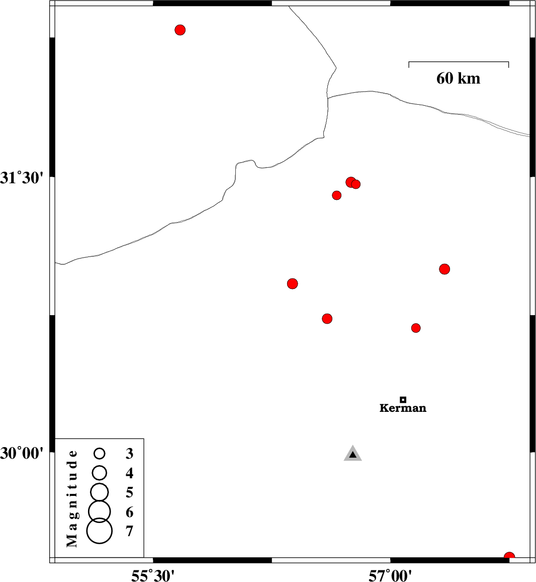 | 2012/08/08 | 08:37:20.3 | 13:07:20.3 | 30.92 | 56.38 | 6 | ML:3 | Kerman Province, 21 km North-West of Zarand | ||