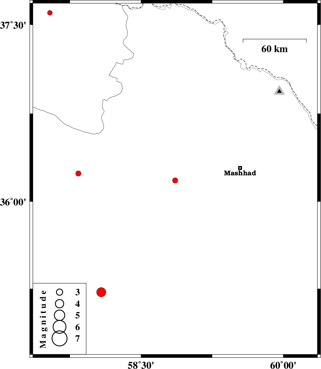 | 2012/07/20 | 00:16:51.4 | 04:46:51.4 | 35.22 | 58.08 | 26 | ML:4.4 | Khorasan(center) Province, 13 km East of Bardeskan | ||