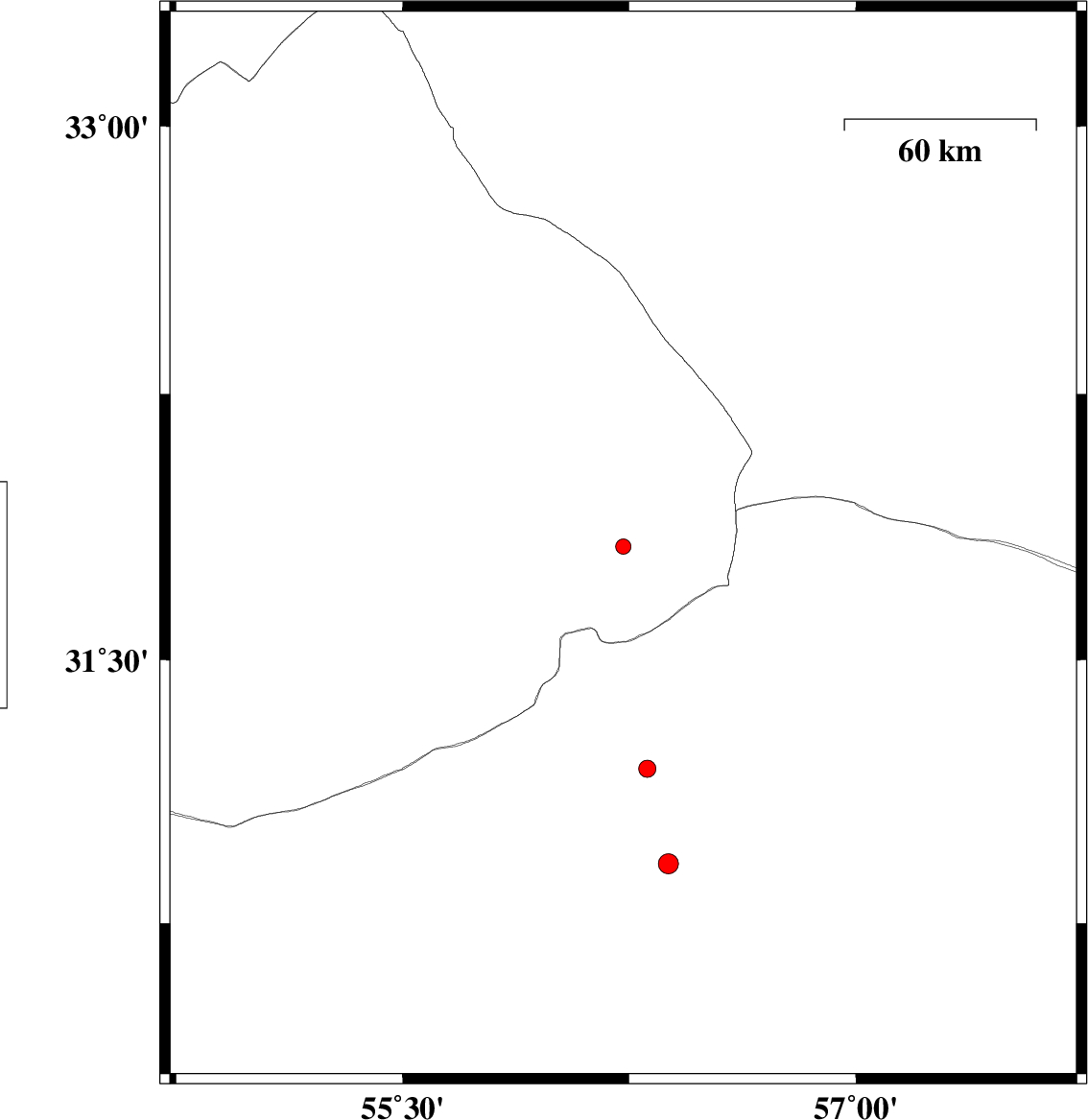 | 2012/08/10 | 00:09:34.8 | 04:39:34.8 | 31.82 | 56.23 | 35 | ML:2.2 | Yazd Province, 82 km North-East of Bafq | ||
