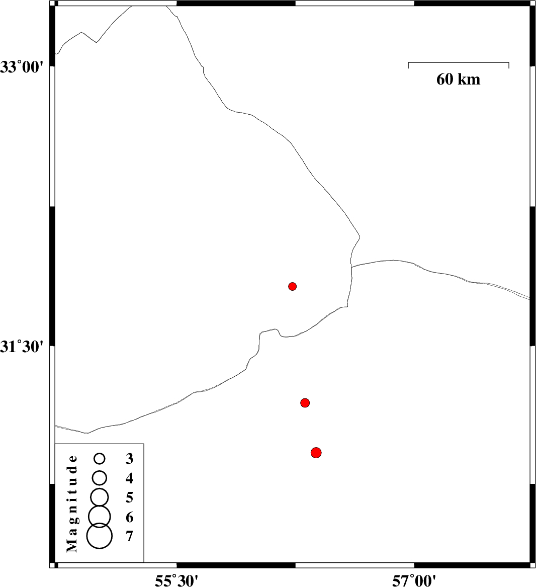 | 2012/08/08 | 08:37:20.3 | 13:07:20.3 | 30.92 | 56.38 | 6 | ML:3 | Kerman Province, 21 km North-West of Zarand |