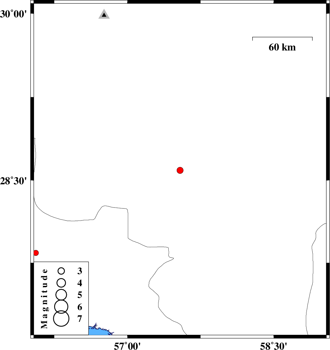 | 2012/08/10 | 06:14:27.8 | 10:44:27.8 | 28.59 | 57.54 | 14 | ML:2.9 | Kerman Province, 21 km West of Jiroft | ||