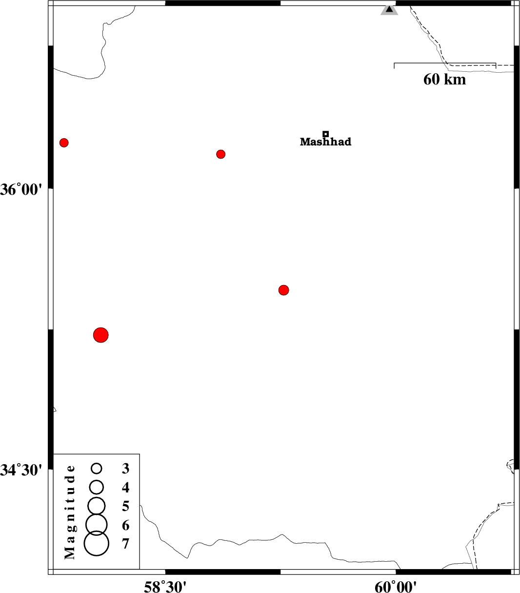 | 2012/07/20 | 00:16:51.4 | 04:46:51.4 | 35.22 | 58.08 | 26 | ML:4.4 | Khorasan(center) Province, 13 km East of Bardeskan | ||