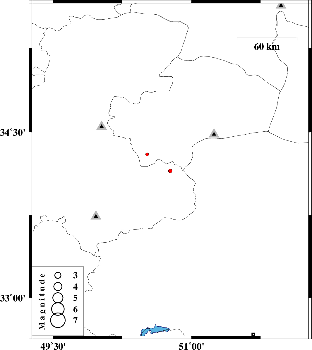 | 2012/08/12 | 12:16:10.3 | 16:46:10.3 | 34.15 | 50.77 | 23 | ML:1.8 | Markazi Province, 19 km North of Delijan | ||