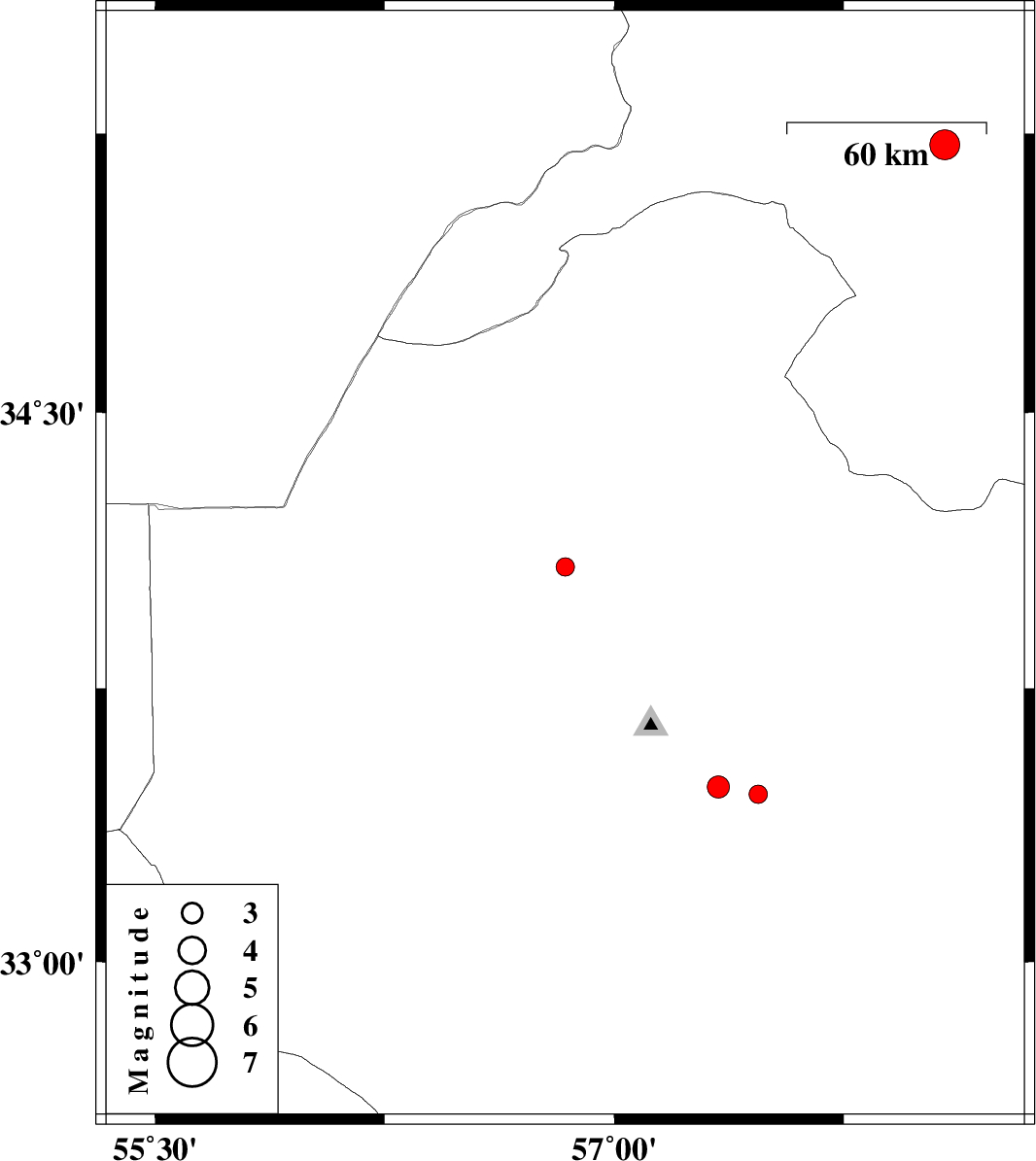 | 2012/08/09 | 11:06:40.6 | 15:36:40.6 | 33.46 | 57.47 | 11 | ML:2.7 | Yazd Province, 53 km South-East of Tabas | ||