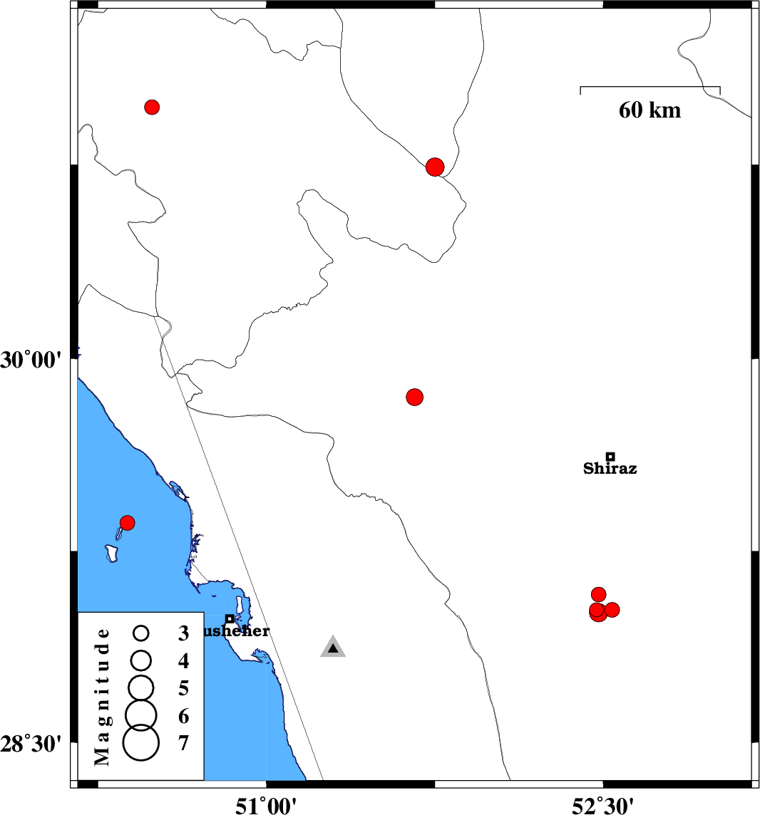 | 2012/08/14 | 13:01:53.3 | 17:31:53.3 | 29.85 | 51.66 | 43 | ML:3.4 | Fars Province, 26 km North of Kazerun | ||
