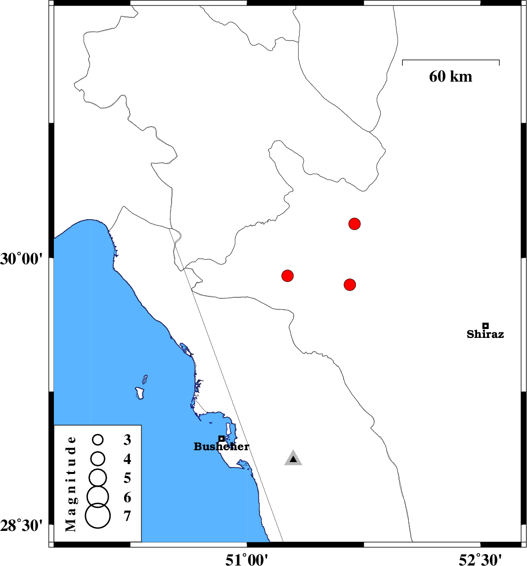 | 2012/08/14 | 13:01:53.3 | 17:31:53.3 | 29.85 | 51.66 | 43 | ML:3.4 | Fars Province, 26 km North of Kazerun |