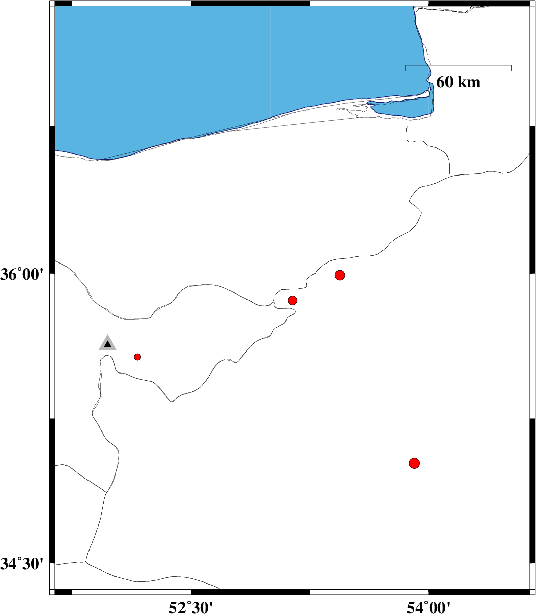 | 2012/08/16 | 22:00:51.4 | 02:30:51.4 | 35.86 | 53.14 | 18 | ML:2.6 | Semnan Province, 30 km South of Pol-E-Sefid | ||