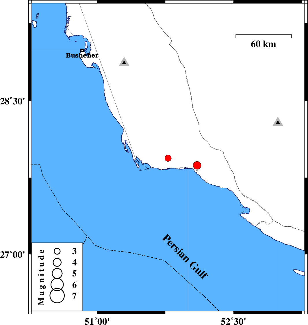 | 2012/08/18 | 19:17:31.6 | 23:47:31.6 | 27.87 | 52.1 | 37 | ML:4 | Bushehr Province, 6 km Bandar-e kangan |