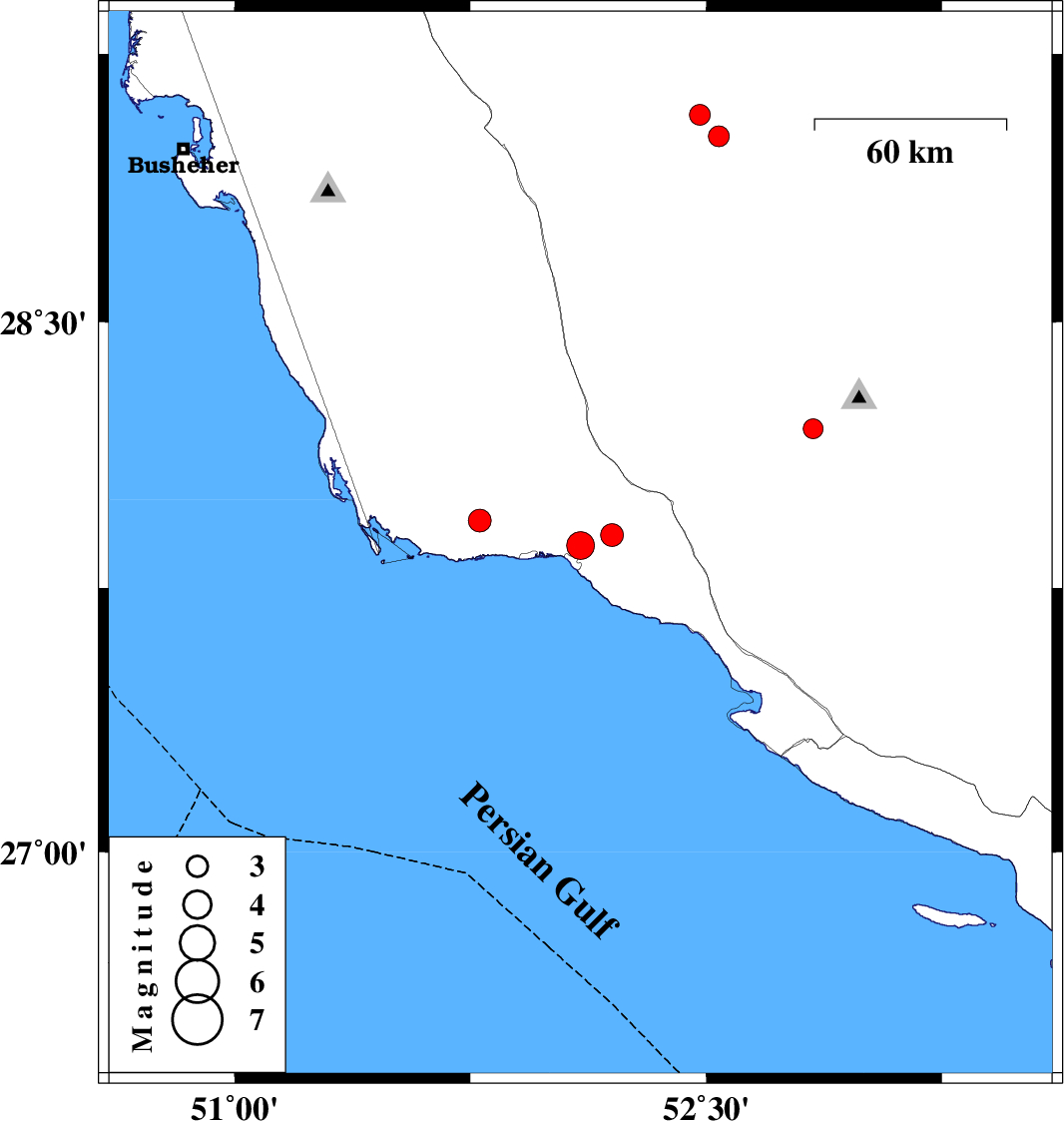 | 2012/07/24 | 01:58:59.5 | 06:28:59.5 | 27.9 | 52.2 | 38 | ML:3.3 | Bushehr Province, 14 km West of Jam | ||