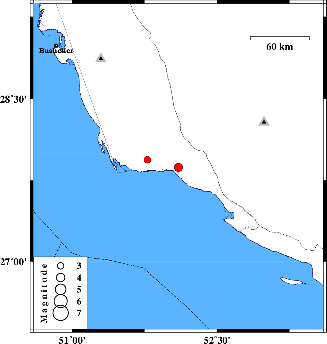 | 2012/08/18 | 19:17:31.6 | 23:47:31.6 | 27.87 | 52.1 | 37 | ML:4 | Bushehr Province, 6 km Bandar-e kangan |