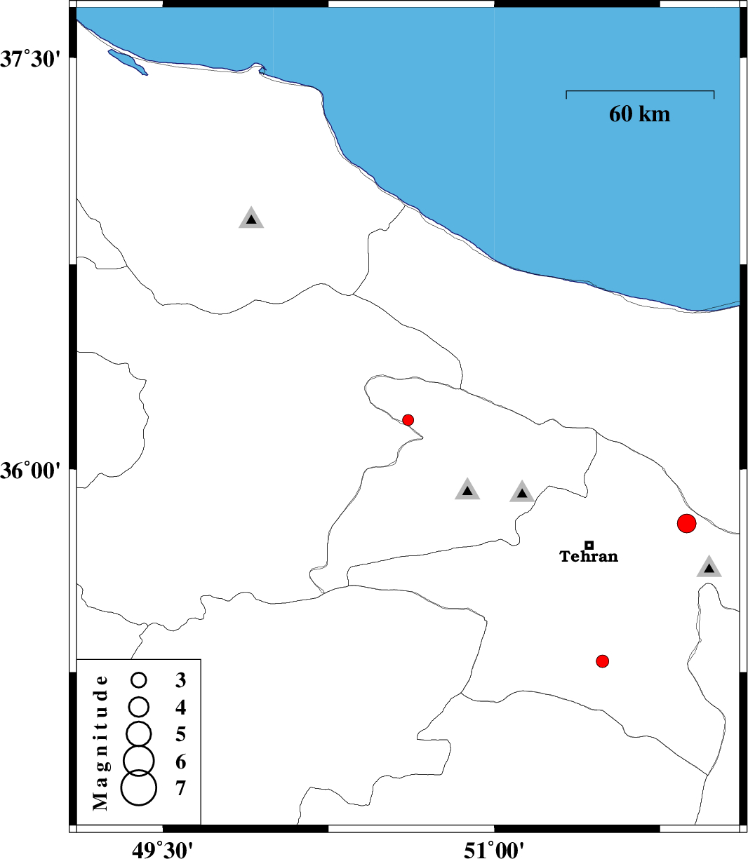 | 2012/08/19 | 11:28:04.3 | 15:58:04.3 | 36.18 | 50.61 | 14 | ML:2.2 | Tehran Province, 17 km North of Abyek | ||