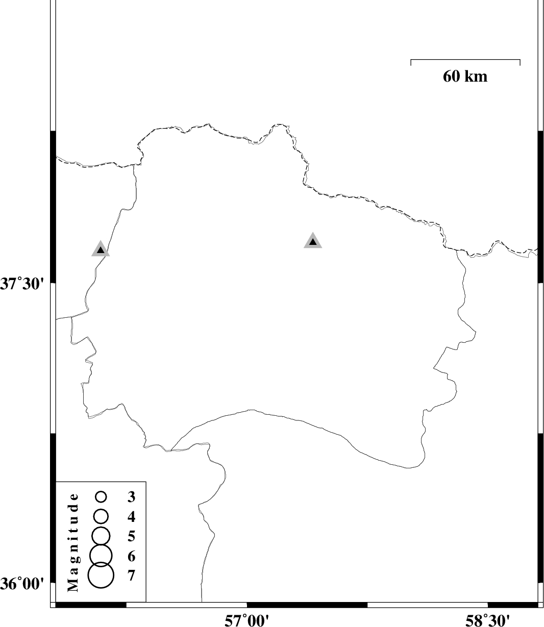 | 2012/08/20 | 16:30:39.7 | 21:00:39.7 | 37.4 | 57.31 | 15 | ML:2.4 | Khorasan(north) Province, 9 km Bojnurd |