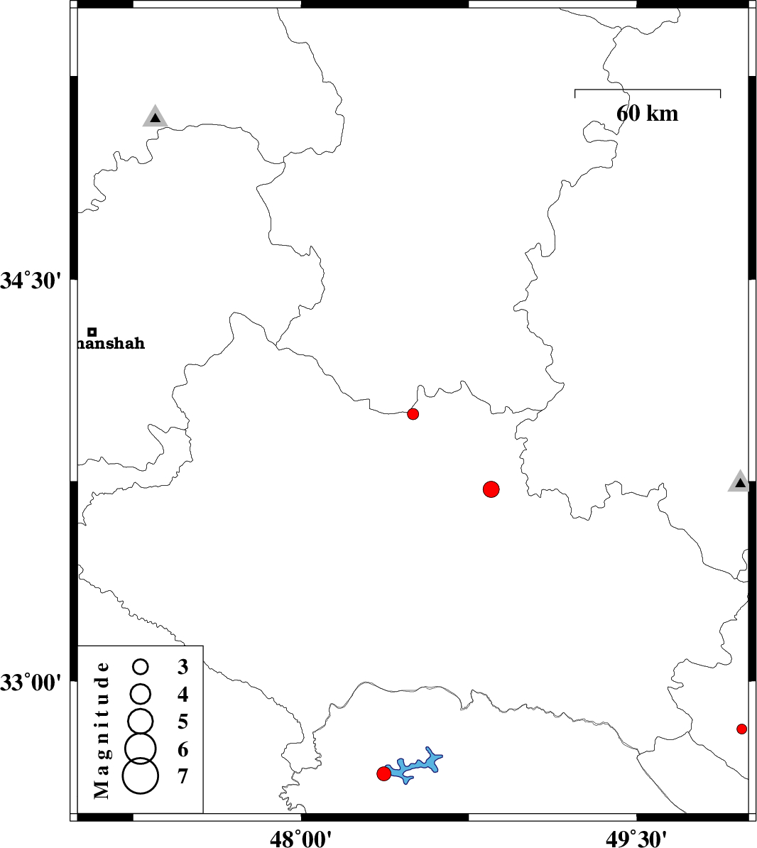 | 2012/08/20 | 00:09:11.1 | 04:39:11.1 | 33.72 | 48.85 | 17 | ML:3.3 | Lorestan Province, 22 km South of Borujerd | ||