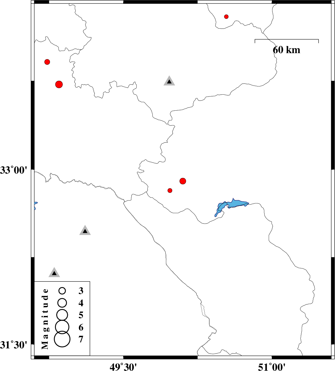 | 2012/08/22 | 06:44:01.7 | 11:14:01.7 | 32.82 | 49.97 | 14 | ML:2 | Esfahan Province, 19 km South-West of Fereydunshahr | ||