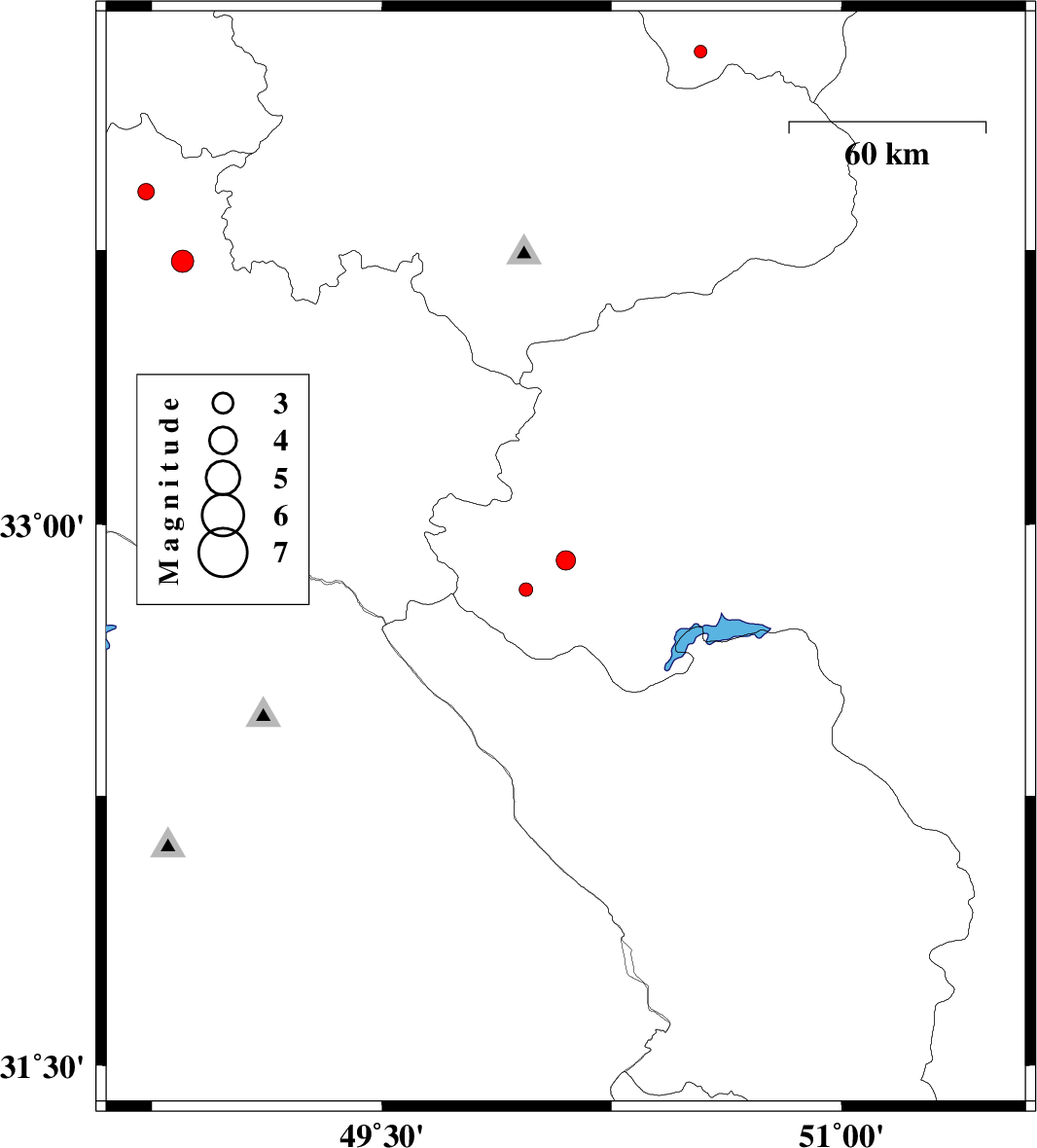 | 2012/08/20 | 00:09:11.1 | 04:39:11.1 | 33.72 | 48.85 | 17 | ML:3.3 | Lorestan Province, 22 km South of Borujerd | ||