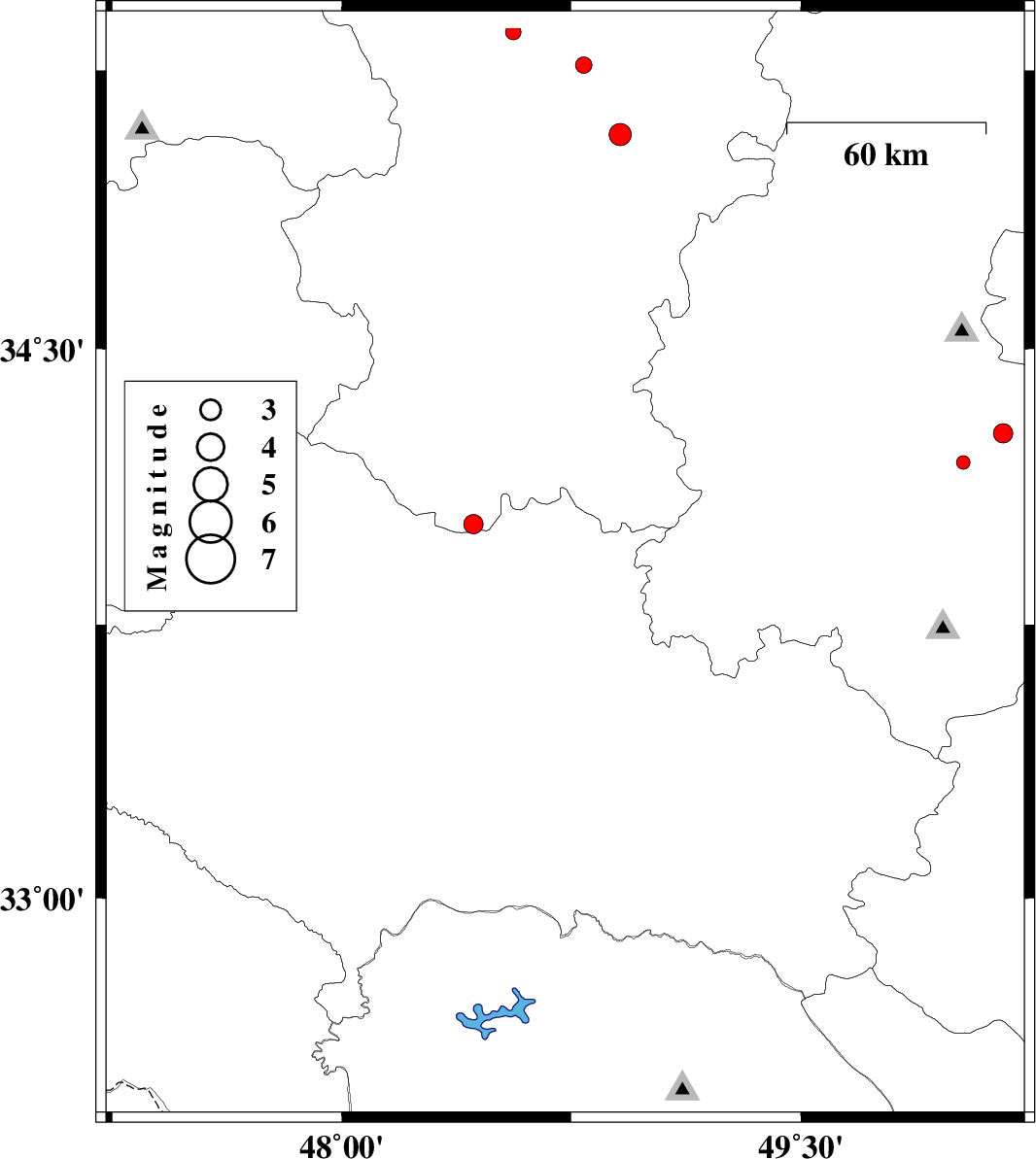 | 2012/08/20 | 00:09:11.1 | 04:39:11.1 | 33.72 | 48.85 | 17 | ML:3.3 | Lorestan Province, 22 km South of Borujerd | ||