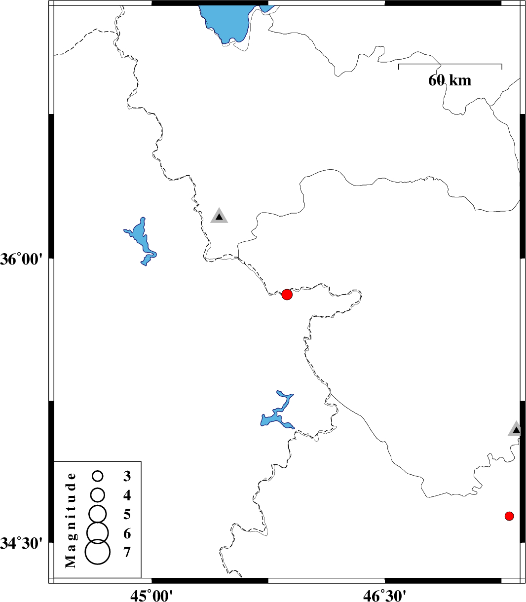 | 2012/08/23 | 18:07:56.9 | 22:37:56.9 | 35.81 | 45.87 | 14 | ML:3.1 | Kordestan Province, 20 km South of Baneh | ||