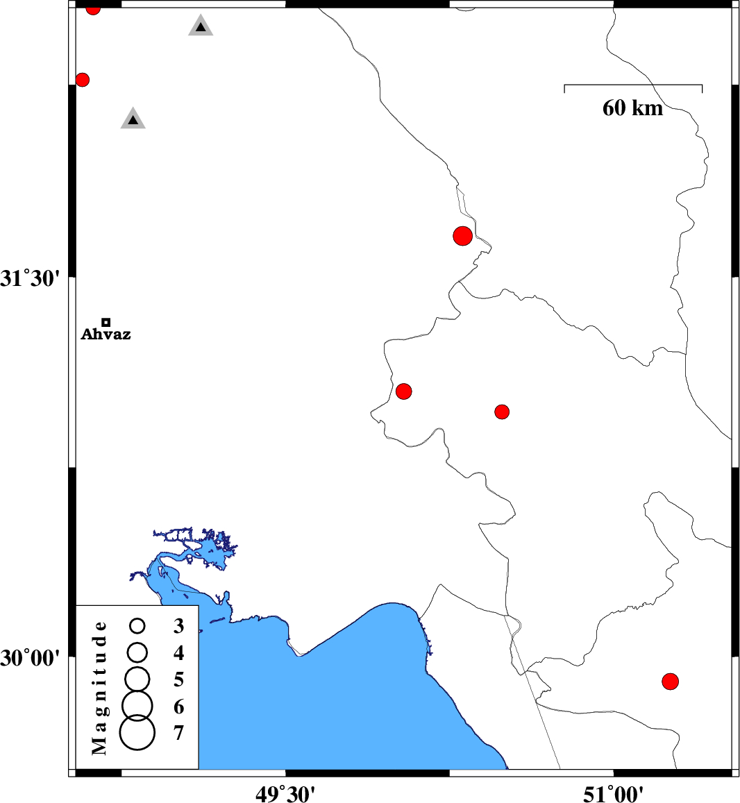 | 2012/08/06 | 00:19:07.3 | 04:49:07.3 | 32.27 | 48.57 | 14 | ML:2.8 | Khoozestan Province, 20 km South-East of Dezful | ||