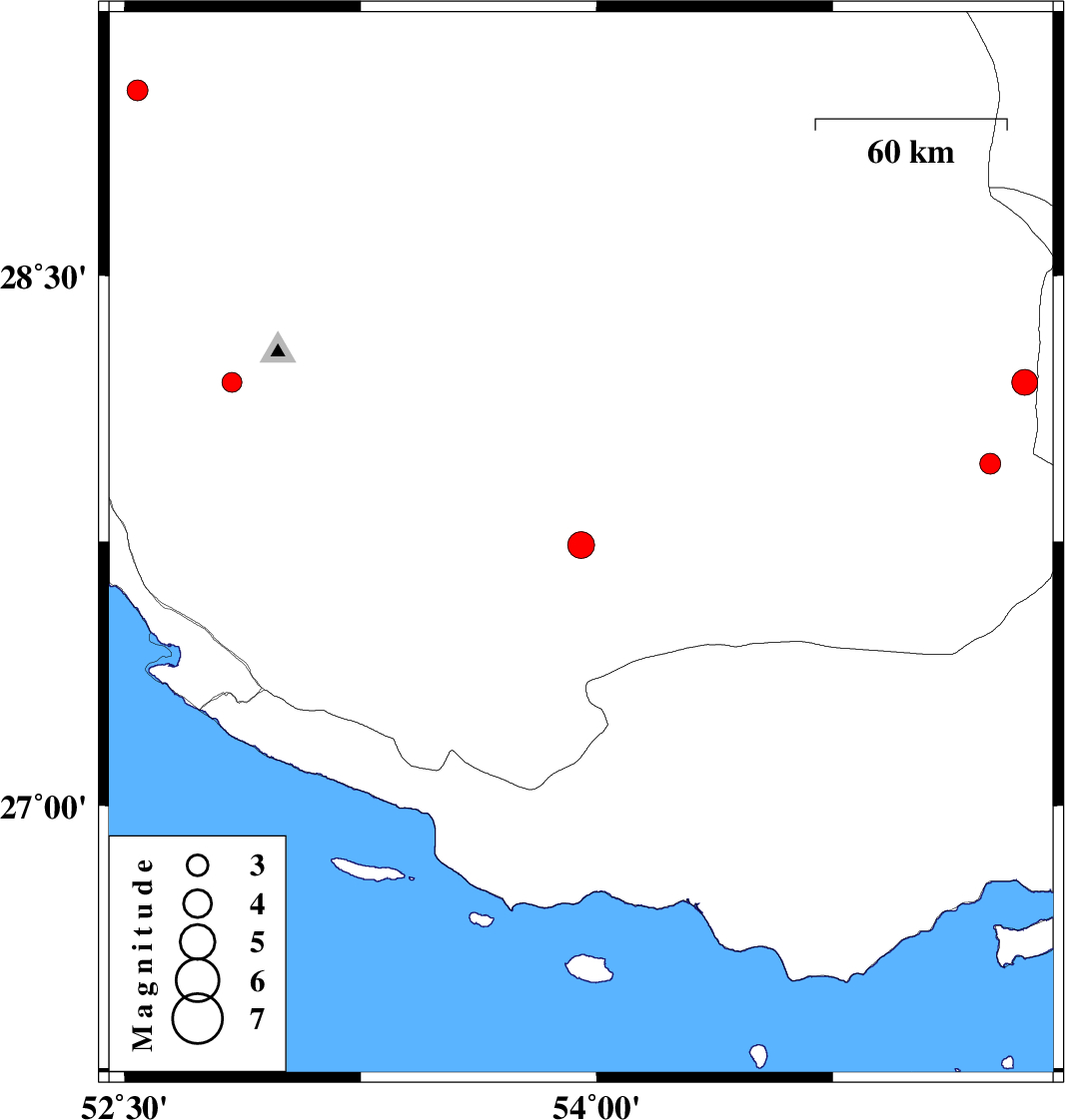 | 2012/07/26 | 04:44:22.7 | 09:14:22.7 | 28.2 | 52.84 | 14 | ML:2.8 | Fars Province, 35 km South-West of Qir va Karzin |