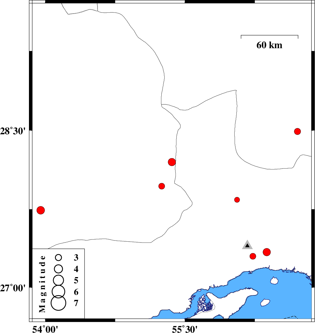 | 2012/07/30 | 17:18:19.8 | 21:48:19.8 | 27.97 | 55.25 | 14 | ML:2.9 | Fars Province, 74 km South-West of Hajiabad |