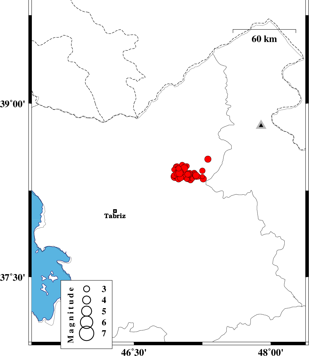 2012/08/19 | 01:46:12.4 | 06:16:12.4 | 38.4 | 46.8 | 14 | ML:2.9 | Azarbaijan Sharghi Province, 26 km West of Ahar | ||