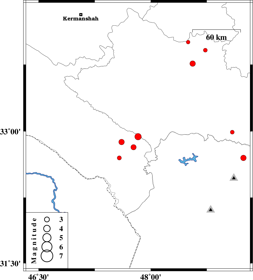| 2012/08/28 | 06:24:19.0 | 10:54:19.0 | 32.88 | 47.61 | 14 | ML:3.4 | Ilam Province, 15 km East of Abdanan | ||