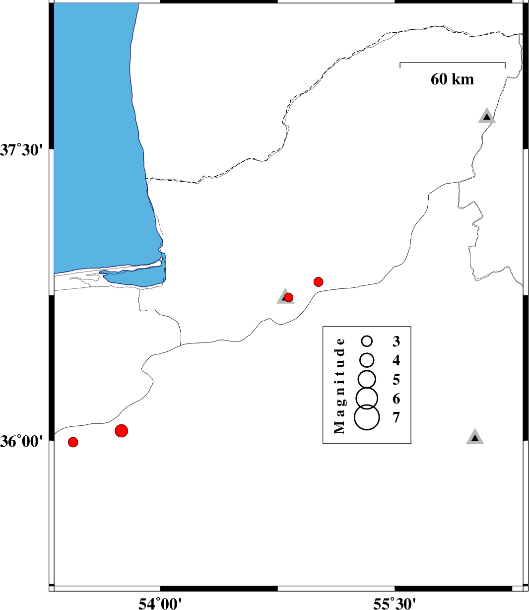 | 2012/08/05 | 19:54:44.5 | 00:24:44.5 | 36.05 | 53.75 | 14 | ML:3.6 | Semnan Province, 55 km South-West of Damghan |