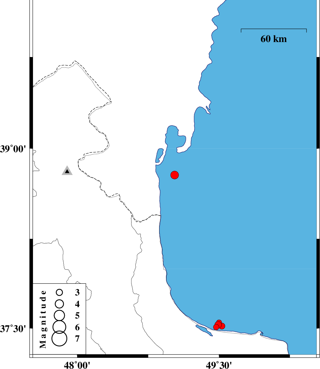 | 2012/08/30 | 20:15:33.9 | 00:45:33.9 | 38.78 | 49.03 | 20 | ML:3.8 | Caspian Sea, 43 km North-East of Astara | ||