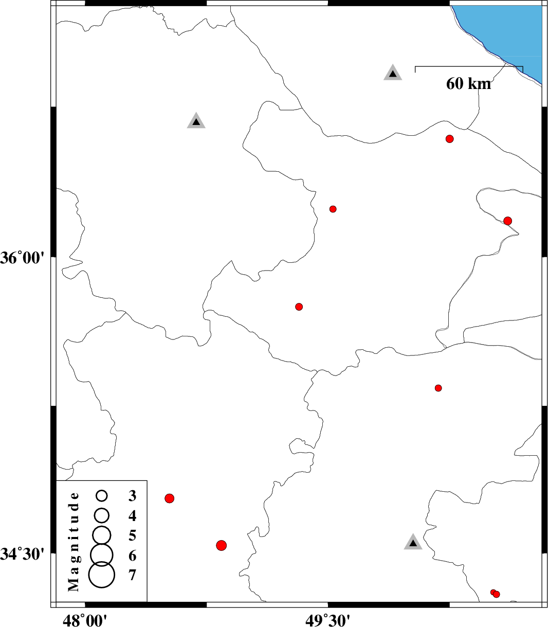 | 2012/08/19 | 11:28:04.3 | 15:58:04.3 | 36.18 | 50.61 | 14 | ML:2.2 | Tehran Province, 17 km North of Abyek | ||
