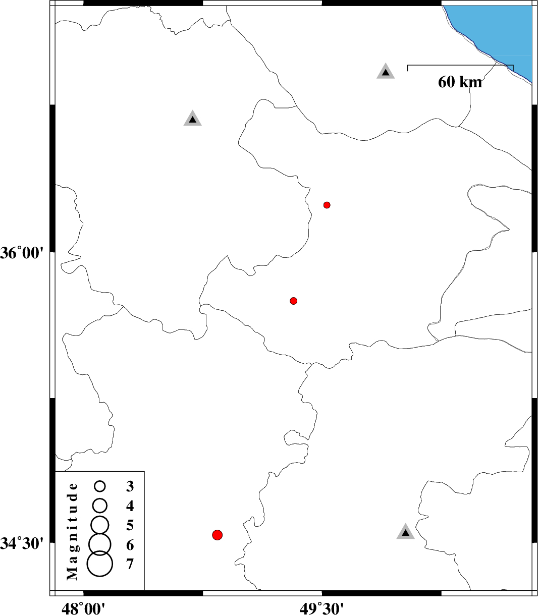 | 2012/08/30 | 13:37:52.4 | 18:07:52.4 | 34.54 | 48.84 | 32 | ML:2.8 | Hamedan Province, 27 km North of Malayer | ||