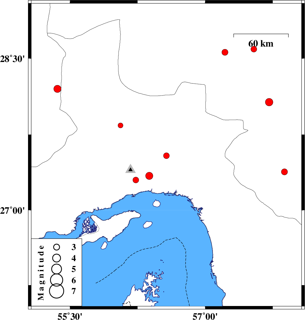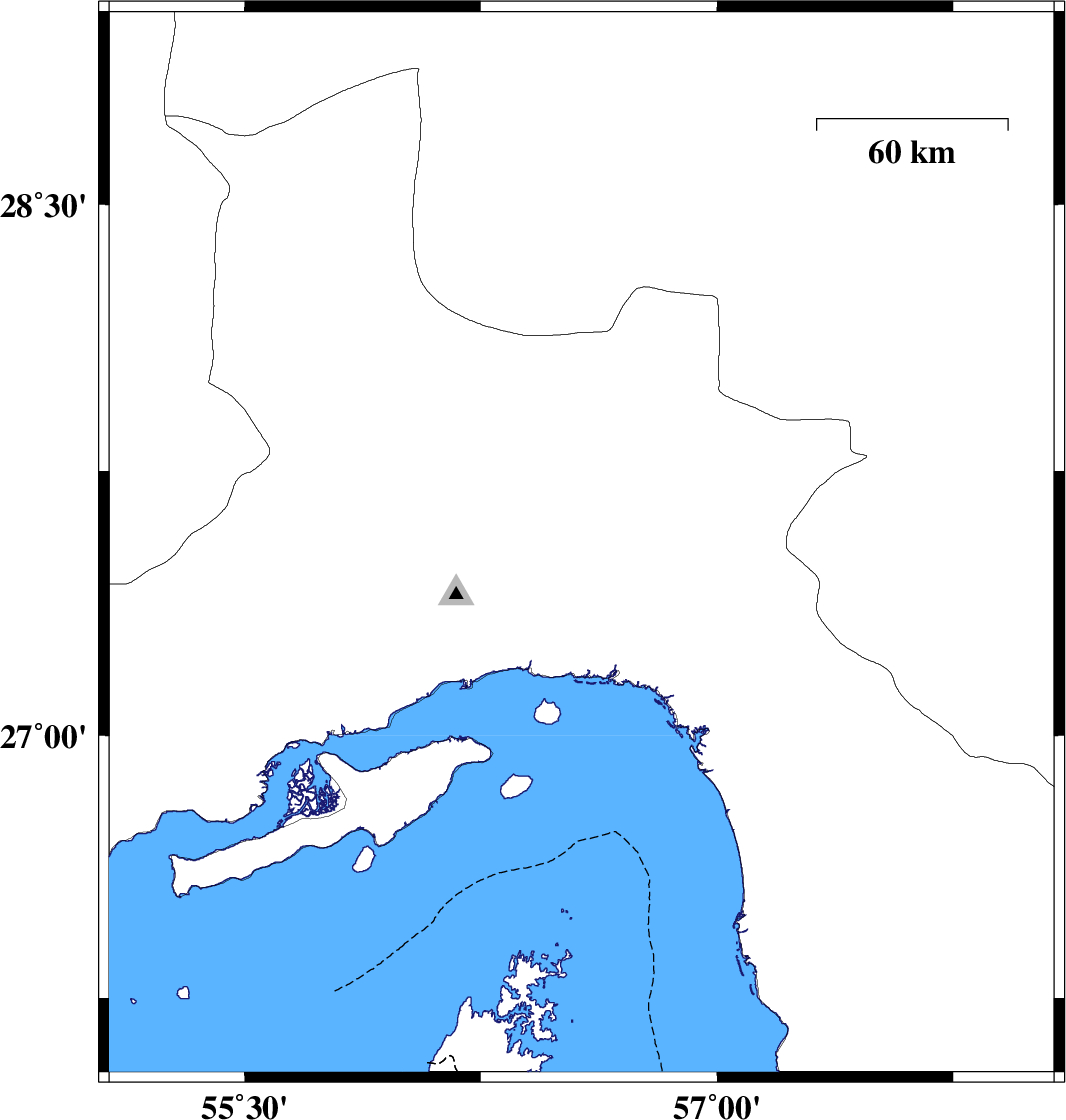 | 2012/08/31 | 09:30:46.1 | 14:00:46.1 | 27.54 | 56.57 | 14 | ML:3 | Hormozgan Province, 49 km North-East of Bandar-e abbas | ||