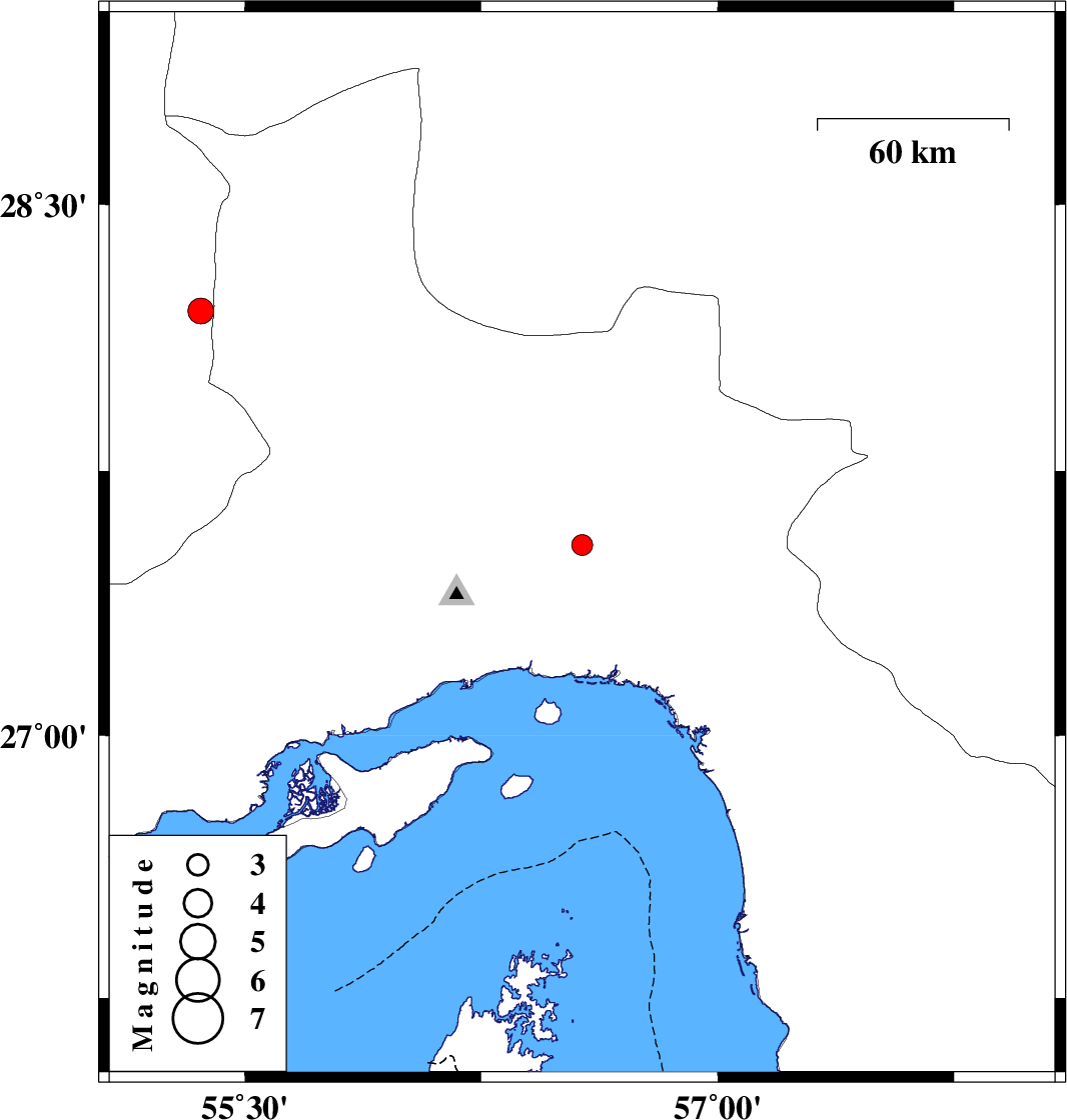 | 2012/08/31 | 09:30:46.1 | 14:00:46.1 | 27.54 | 56.57 | 14 | ML:3 | Hormozgan Province, 49 km North-East of Bandar-e abbas | ||