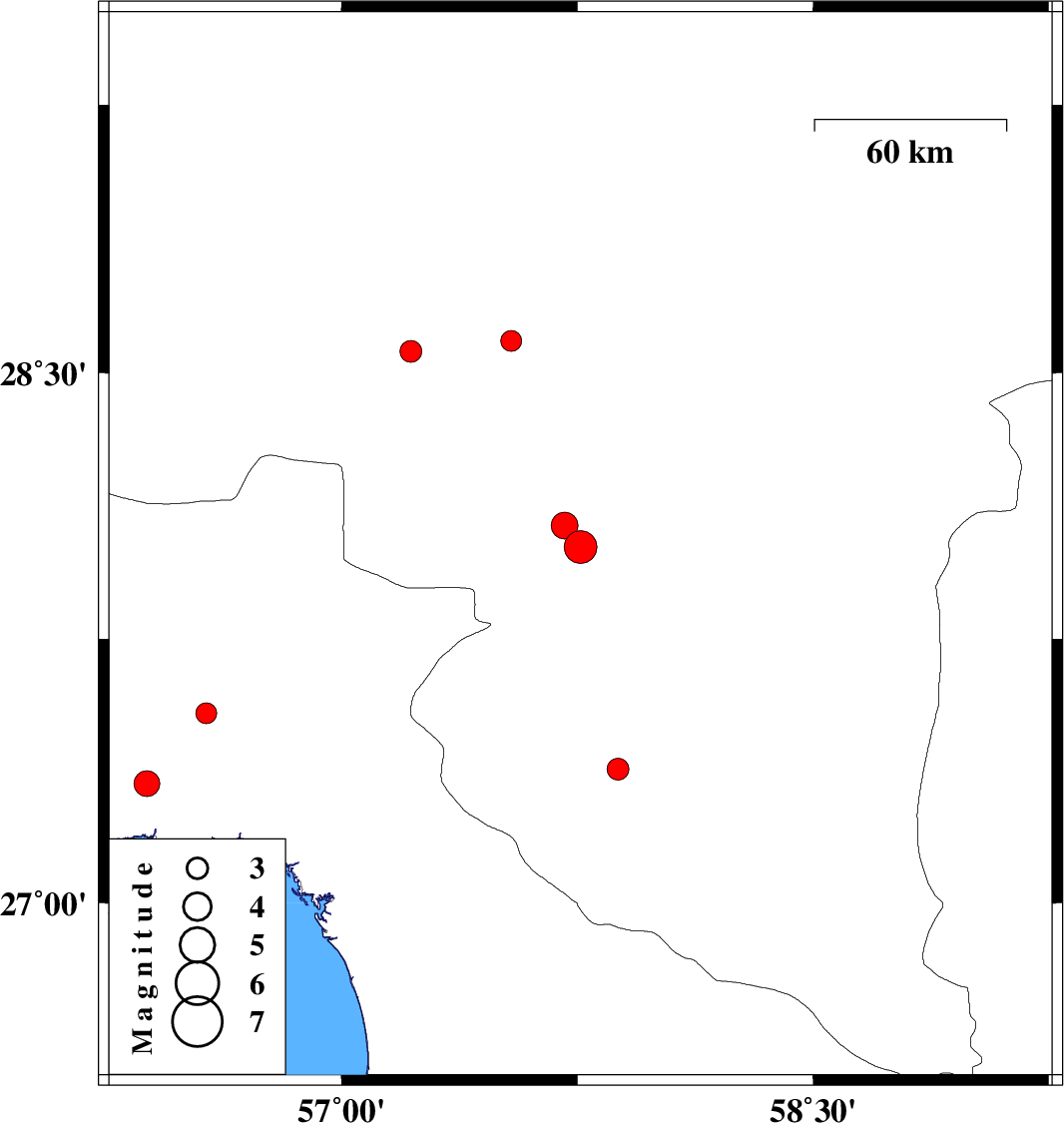 | 2012/08/31 | 09:30:46.1 | 14:00:46.1 | 27.54 | 56.57 | 14 | ML:3 | Hormozgan Province, 49 km North-East of Bandar-e abbas | ||