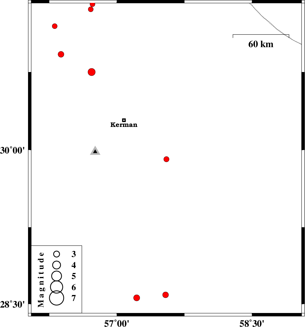 | 2012/08/08 | 08:37:20.3 | 13:07:20.3 | 30.92 | 56.38 | 6 | ML:3 | Kerman Province, 21 km North-West of Zarand |