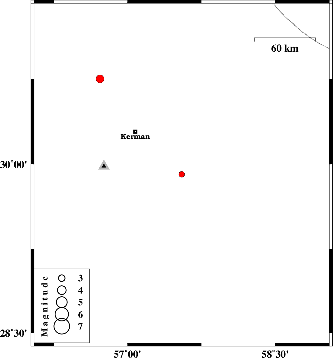 | 2012/09/03 | 20:01:52.0 | 00:31:52.0 | 29.91 | 57.55 | 14 | ML:2.7 | Kerman Province, 62 km South-East of Kerman | ||