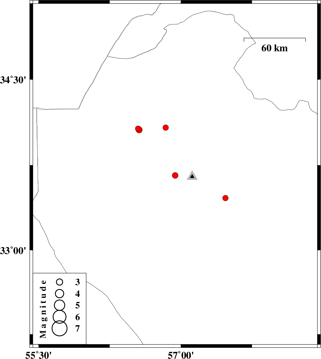 | 2012/08/09 | 11:06:40.6 | 15:36:40.6 | 33.46 | 57.47 | 11 | ML:2.7 | Yazd Province, 53 km South-East of Tabas |