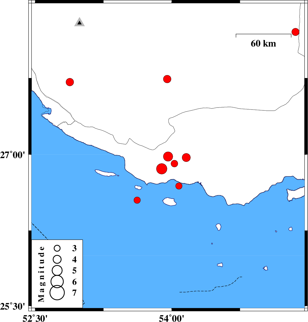 | 2012/09/06 | 03:13:31.1 | 07:43:31.1 | 26.69 | 54.08 | 14 | ML:3.3 | Persian Gulf, 63 km South-West of Bastak | ||