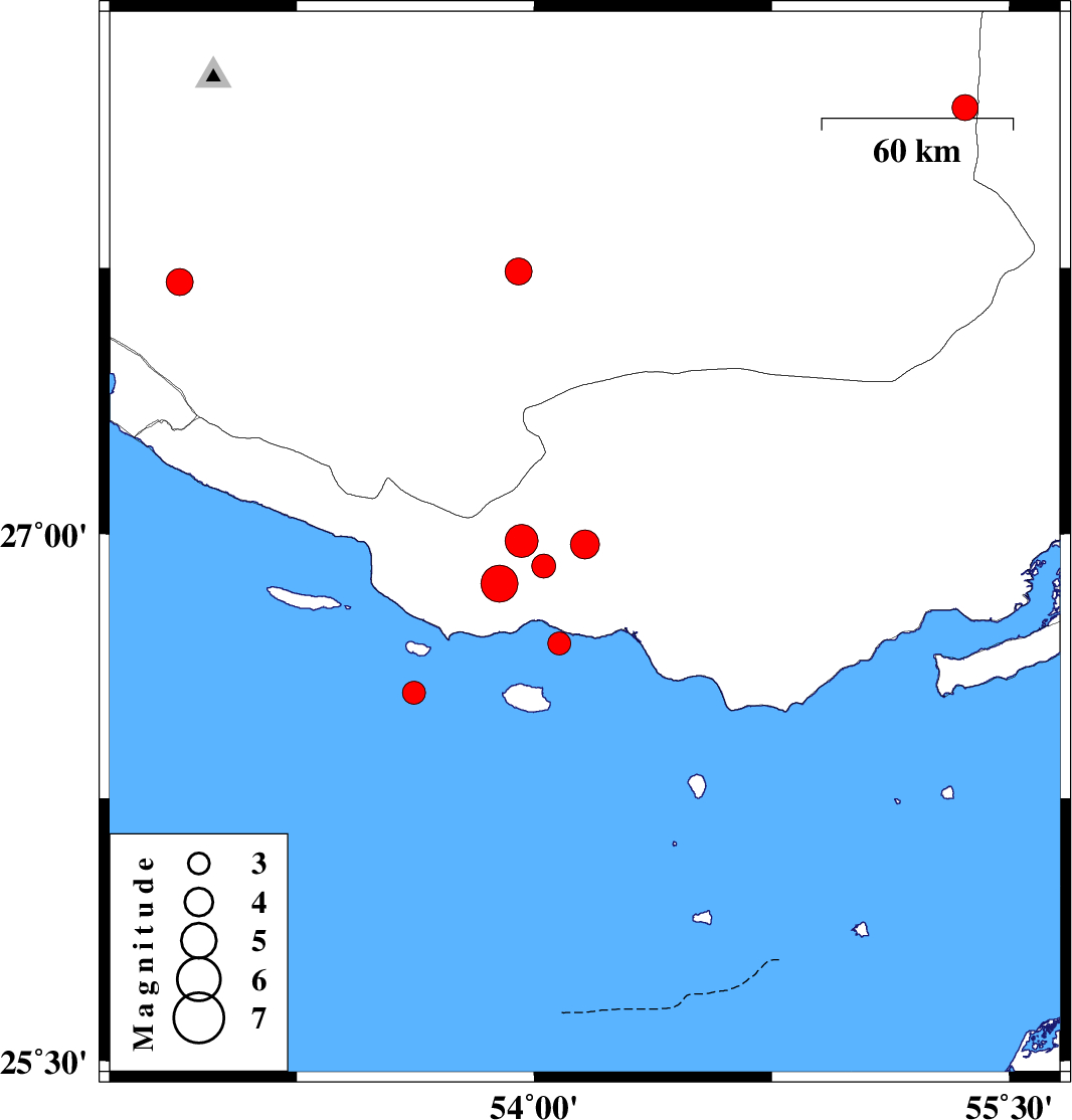 | 2012/09/06 | 03:13:31.1 | 07:43:31.1 | 26.69 | 54.08 | 14 | ML:3.3 | Persian Gulf, 63 km South-West of Bastak | ||