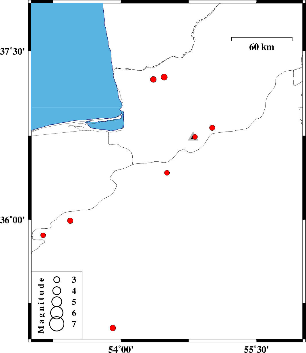 | 2012/09/04 | 00:18:59.4 | 04:48:59.4 | 37.27 | 54.48 | 26 | ML:3.1 | Golestan Province, 29 km North of Aq Qaleh | ||