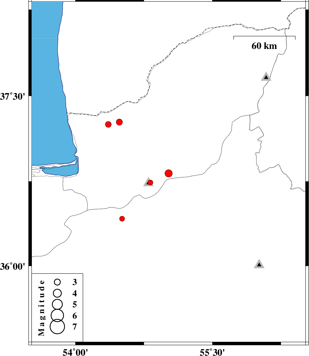 | 2012/09/04 | 00:18:59.4 | 04:48:59.4 | 37.27 | 54.48 | 26 | ML:3.1 | Golestan Province, 29 km North of Aq Qaleh | ||
