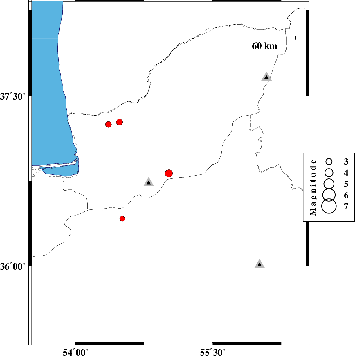| 2012/09/08 | 13:08:02.2 | 17:38:02.2 | 36.82 | 55.02 | 14 | ML:3.6 | Golestan Province, 16 km East of Ali Abad | ||