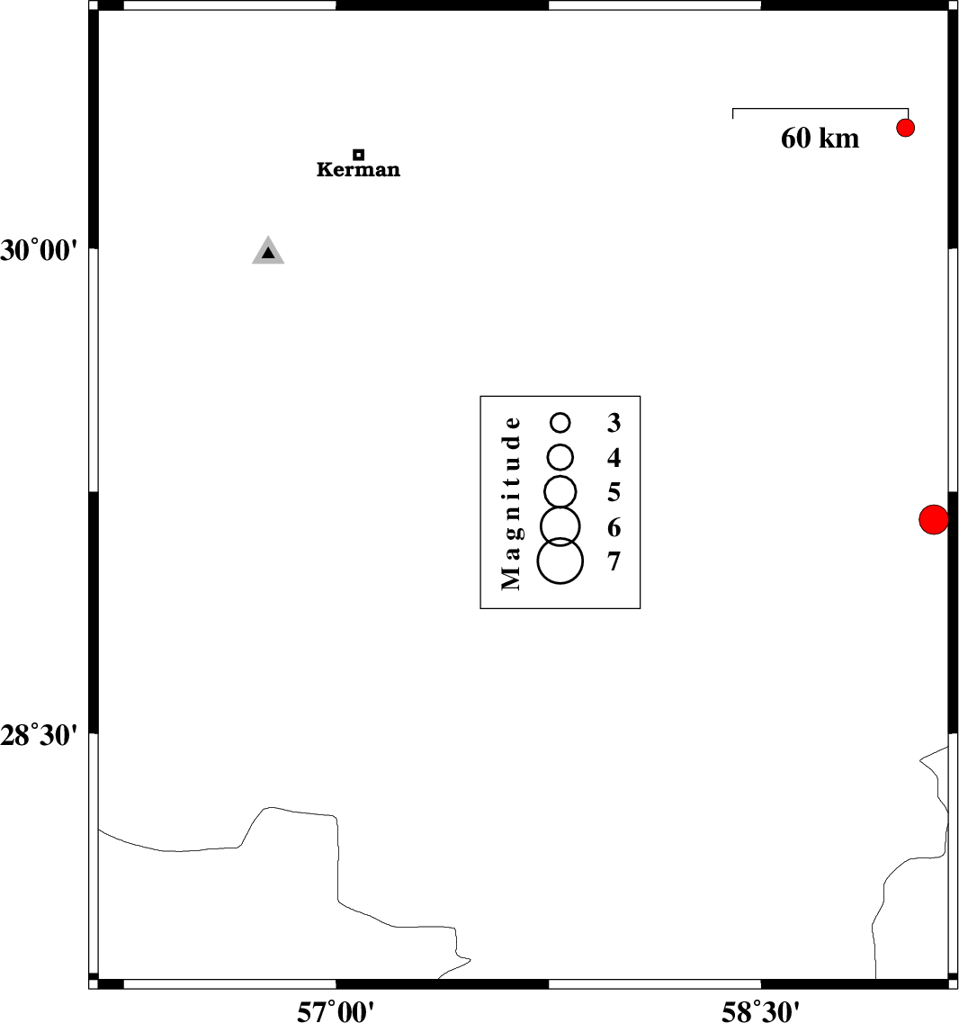 | 2012/09/08 | 21:54:14.6 | 02:24:14.6 | 29.23 | 57.66 | 14 | ML:2.8 | Kerman Province, 62 km North of Jiroft | ||