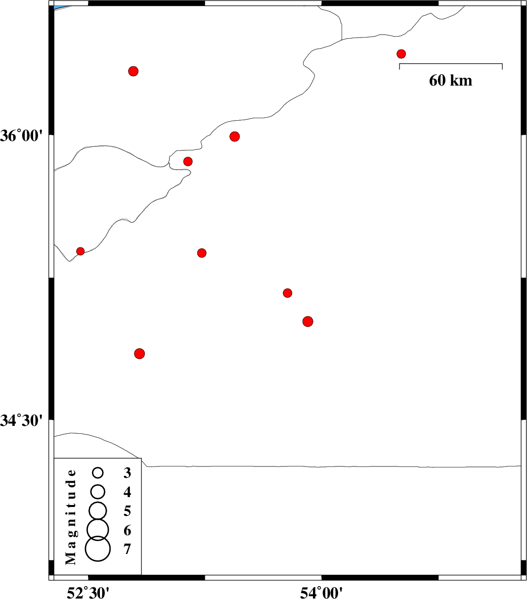 | 2012/09/07 | 04:45:11.3 | 09:15:11.3 | 36.42 | 54.51 | 15 | ML:2.5 | Semnan Province, 32 km North-East of Damghan | ||